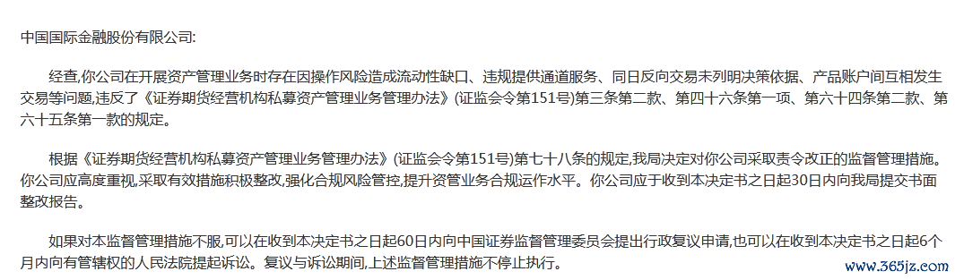 决定显示,经查,中金公司在开展资产管理业务时存在因操作风险造成流动性缺口、违规提供通道服务、同日反向交易未列明决策依据、产品账户间互相发生交易等问题,违反相关规定。