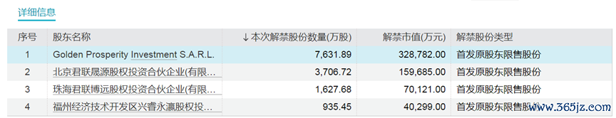 解禁市值第二大的乖宝宠物解禁股东为Golden Prosperity Investment S.A.R.L.、北京君联晟源股权投资合伙企业(有限合伙)、珠海君联博远股权投资合伙企业(有限合伙)等4个股东。