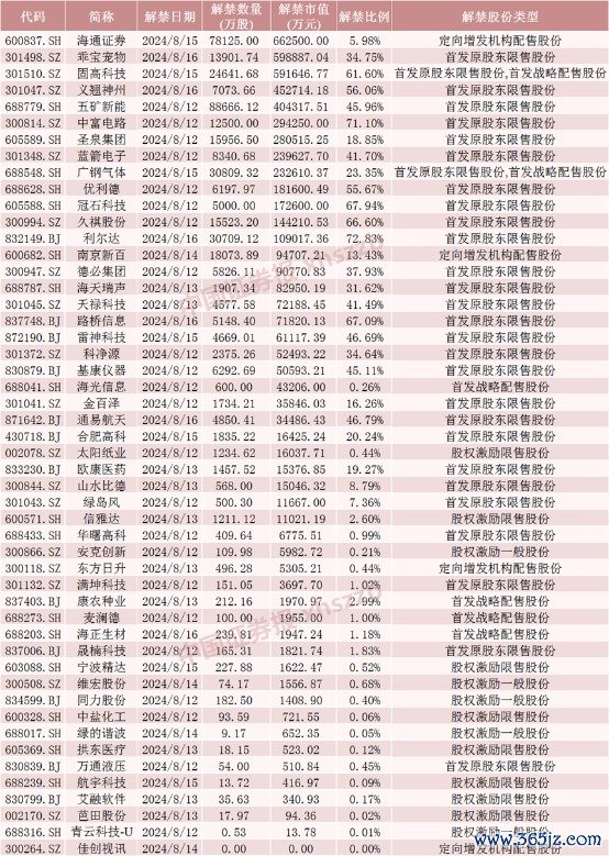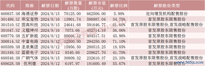 海通证券8月15日将解禁7.81亿股,均为定向增发机构配售股份。乖宝宠物8月16日将解禁1.39亿股,均为首发原股东限售股份。固高科技8月15日将解禁2.46亿股,为首发原股东限售股份和首发战略配售股份。