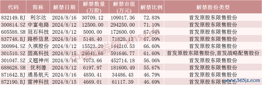 下周解禁比例前十股票