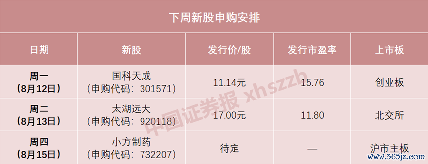 日程安排上,下周一(8月12日)可申购国科天成,下周二(8月13日)可申购太湖远大,下周四(8月15日)可申购小方制药。其中,太湖远大是下半年发行的第一只北交所新股,也是继万达轴承之后的“920第二股”。
