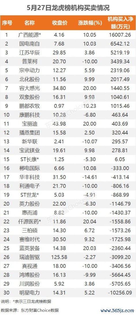 机构参与龙虎榜中个股共涉及30股,其中15股被机构净买入,广西能源被买入最多,三日买入1.6亿元。另外15股被机构净卖出,明星电力被卖出最多,为1.03亿元。