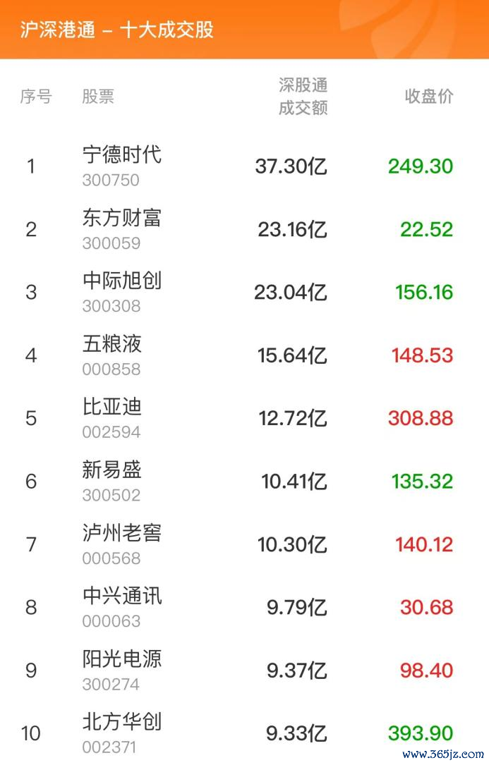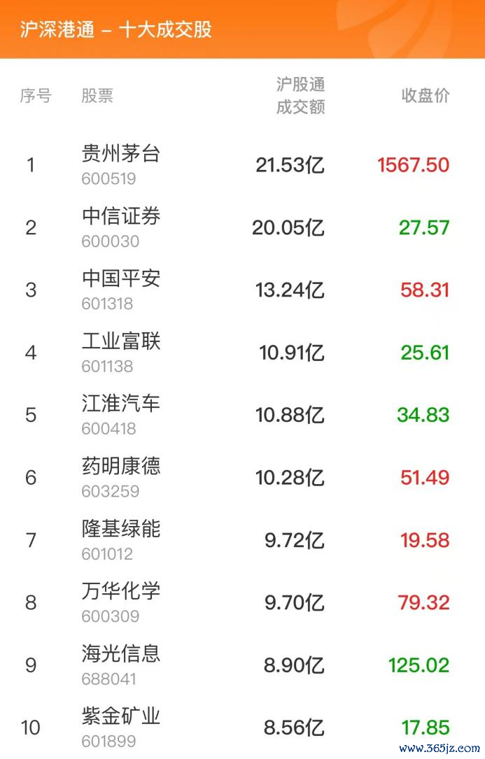 交易所公布的当日沪深港通十大成交股显示,贵州茅台、中信证券、中国平安位列沪股通前三,成交额分别为21.53亿元、20.05亿元、13.24亿元;宁德时代、东方财富、中际旭创位列深股通前三,成交额分别为37.30亿元、23.16亿元、23.04亿元。