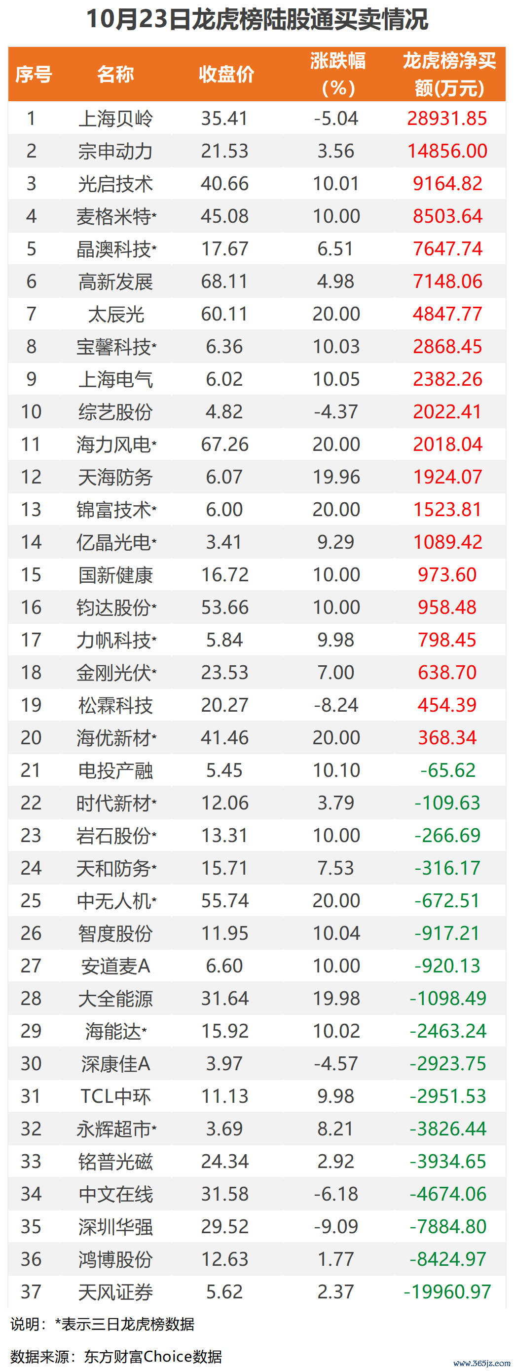 今日陆股通参与龙虎榜中个股共涉及37股,其中20股被陆股通净买入,上海贝岭被买入最多配资资讯宝下载,净买入2.89亿元;另外17股被陆股通净卖出,天风证券被卖出最多,净卖出2亿元。